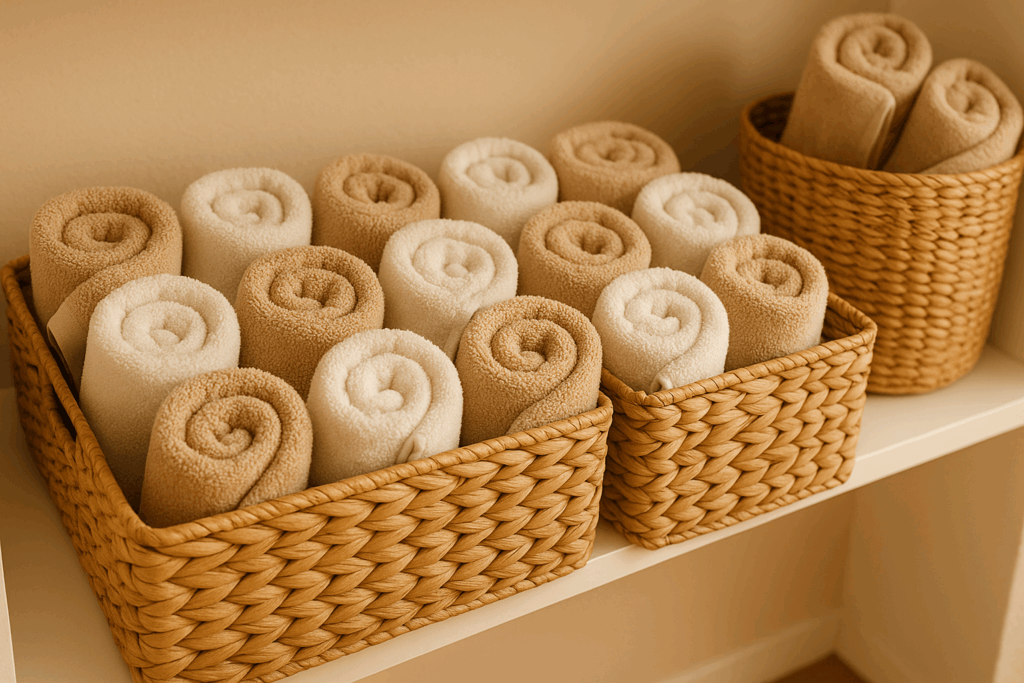 • タオルは丸めて立てるか放り込み収納で時短を実現する