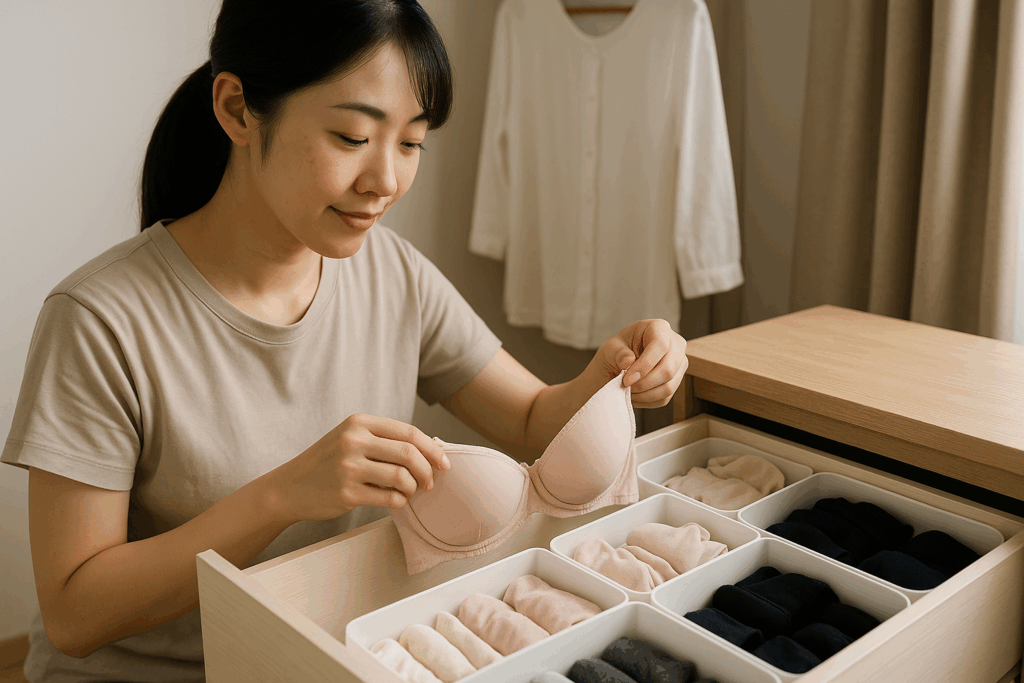 女性用のブラジャーなどは型崩れを防ぐため、カップを重ねてゆったりと収納するか、専用の吊り下げ収納を活用するのも一つのアイデアです。